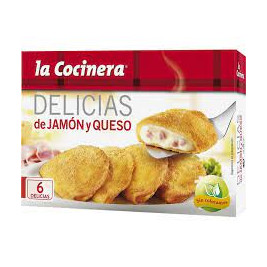 QUESO fundido (50%) [ QUESO, sólidos LÁCTEOS, MANTEQUILLA, almidón modificado, corrector de acidez (ácido cítrico), sales de fundido (E 331, E 452, E 339), sal, aroma], pan rallado [harina de TRIGO, levadura, sal, dextrosa de maíz, cacao], agua, aceite de girasol, harina de...