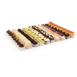 8 variedades de atractivos y deliciosos pastelitos de gran calidad: borracho, lionesa de crema, sarita, mini petisú de chocolate, pastelito de yema, pastel sacher, mini petisú crema, rizado blanco de trufa...