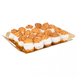 Deliciosos bocaditos de masa choux tradicional, rellenas de un rizado de suave nata montada. Vienen presentadas en una atractiva bandeja dorada con 20 unidades.